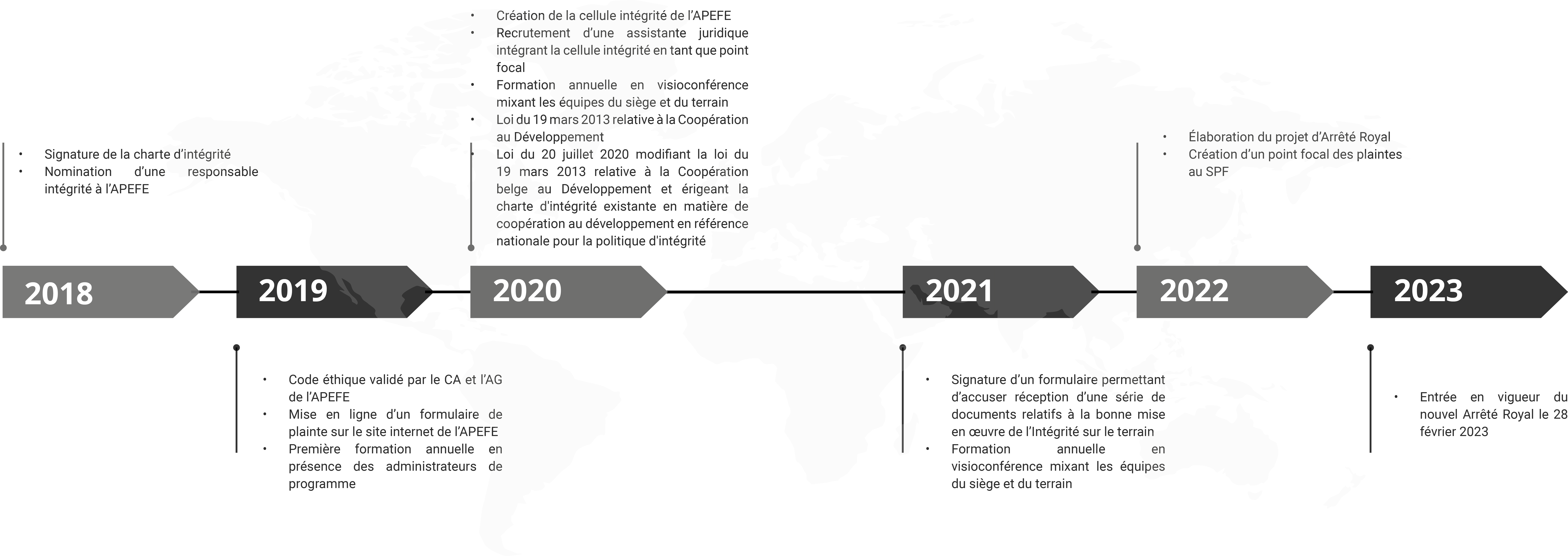 Le 15 juin 2018, l’APEFE a signé la Charte d’intégrité, qui est érigée en référence nationale pour la politique d’intégrité en matière de coopération au développement depuis l’entrée en vigueur de la loi du 20 juillet 2020.