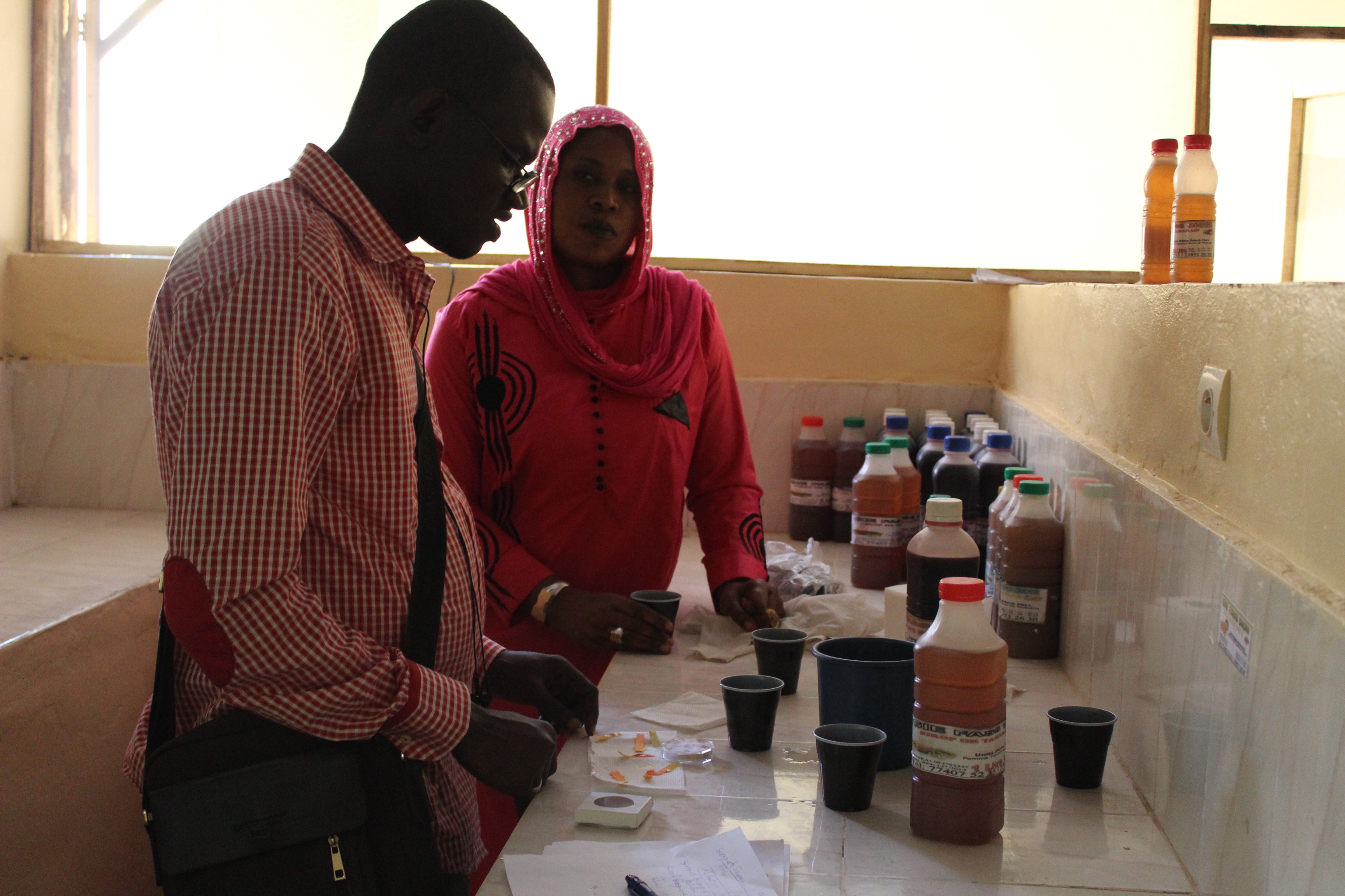 La visite suivante a été consacrée à l’unité de transformation de REFABEC où l’équipe a présenté aux groupements le plan de développement ainsi que les prochaines étapes et améliorations à mettre en place. Moussa, l’expert en charge de la composante technique, a supervisé le processus de transformation du gingembre en sirop afin de contrôler les mesures d’hygiène et les techniques utilisées, pendant que Louis Jérome, chargé de la composante managériale, a révisé les carnets de compte avec les trésorières.