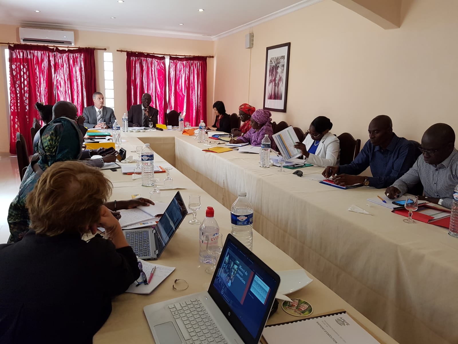 Lors de cette mission, des sessions de travail furent organisées afin de dresser un bilan de l’état d’avancement des différents programmes : l’entrepreneuriat féminin, la formation professionnelle et la formation à distance des instituteurs IFADEM en termes de résultats, de consommation budgétaire, de gestion des ressources et des risques et de qualité des partenariats.