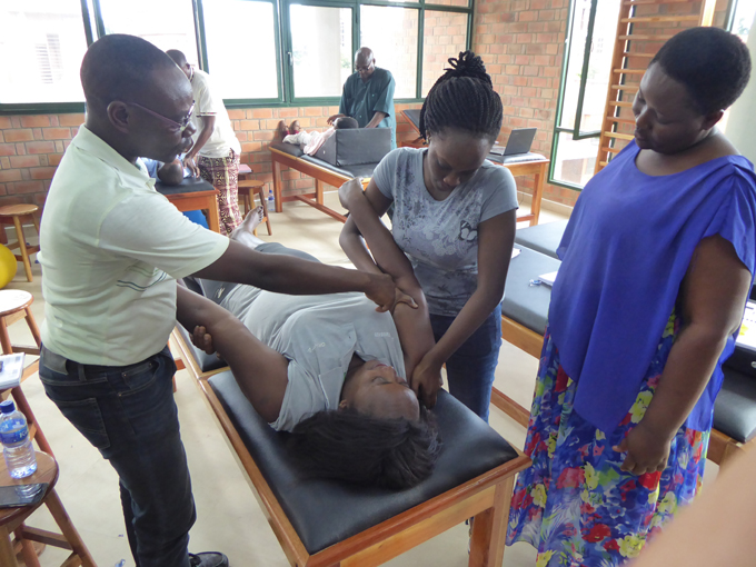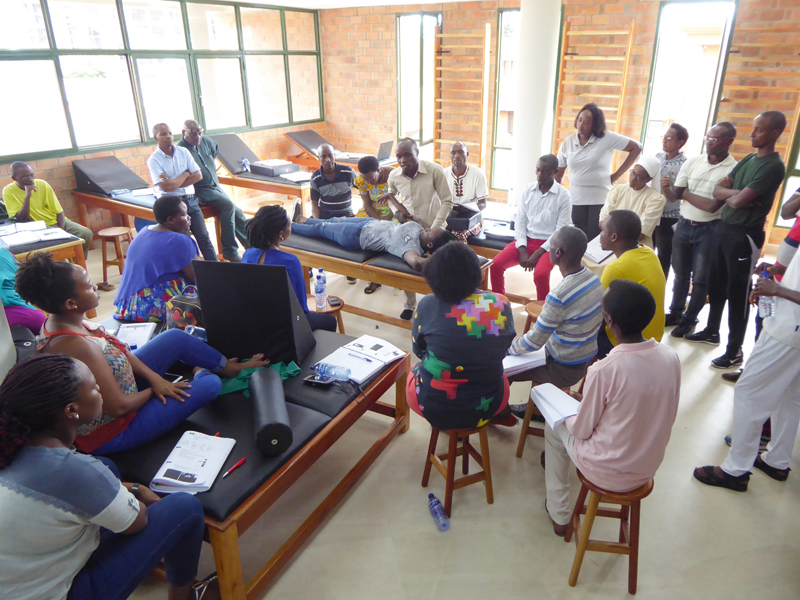 Les 25 kinésithérapeutes en session de formation continue ont donc pu profiter des toutes nouvelles salles de cours théoriques et pratiques de cette école. La formation s’est étalée sur 5 jours et a été animée par Jessy Iteka et Pierre Ndayishimiye, deux kinésithérapeutes burundais du « Centre National de Référence en Kinésithérapie et Réadaptation médicale » (CNRKR), créé en 2016 par le programme de développement de la MPR au sein du CHU de Bujumbura.